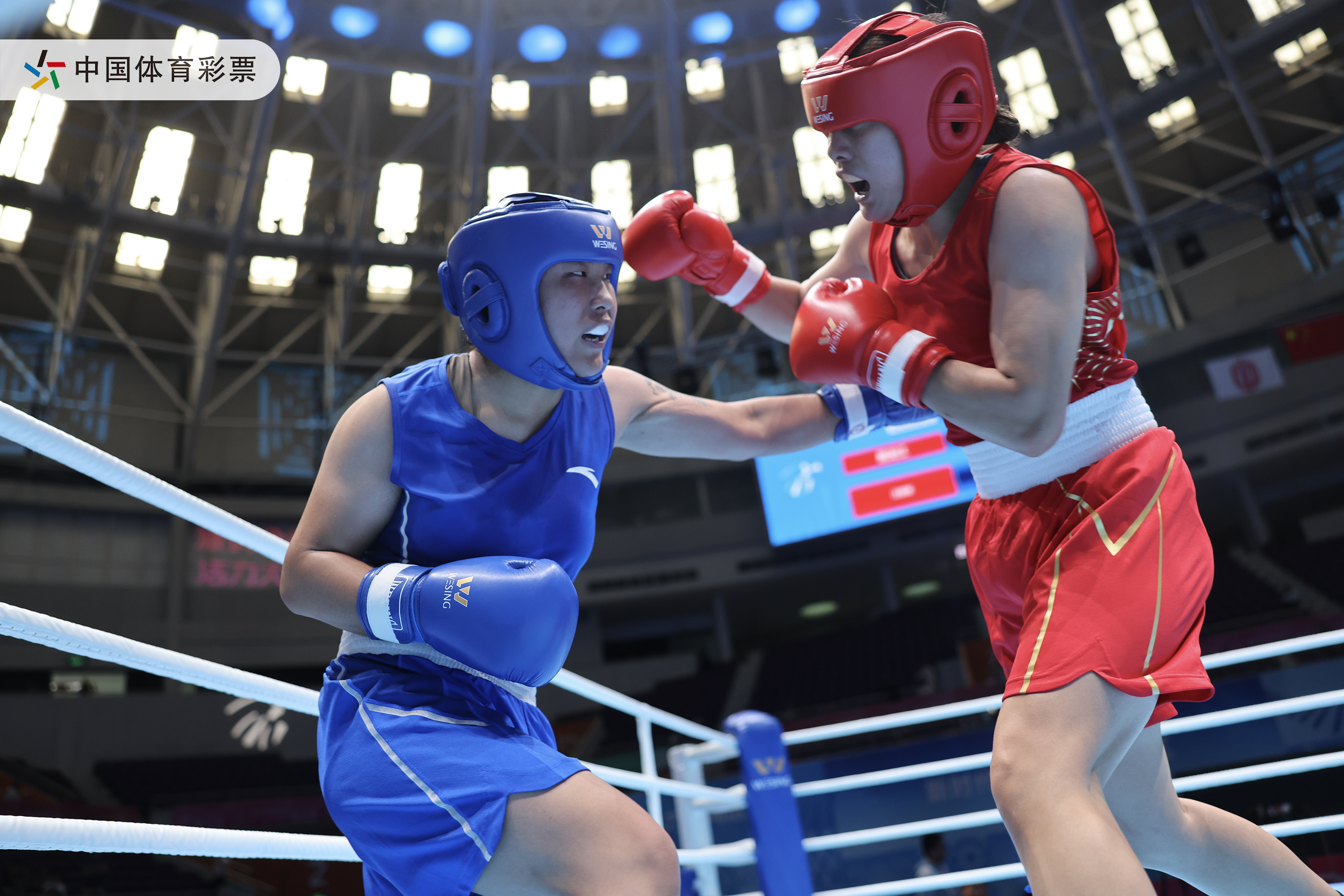 江苏队选手包子怡在第十五届全国运动会拳击女子75公斤级半决赛中惜败黑龙江队选手汪丽娜