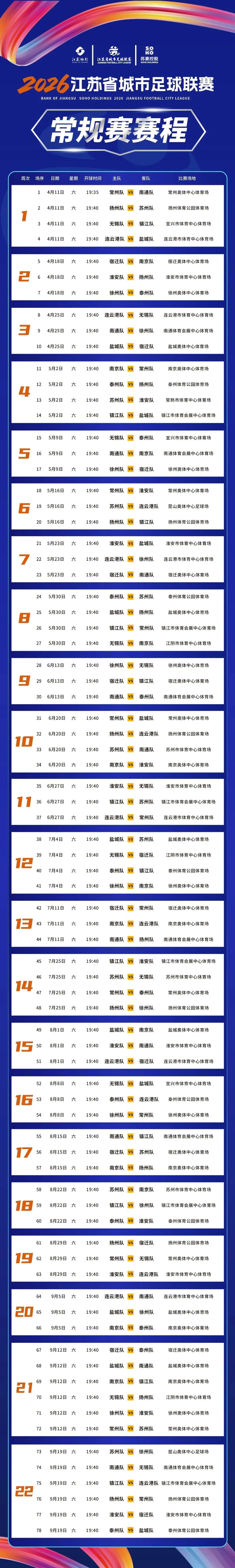2026江苏省城市足球联赛常规赛赛程发布