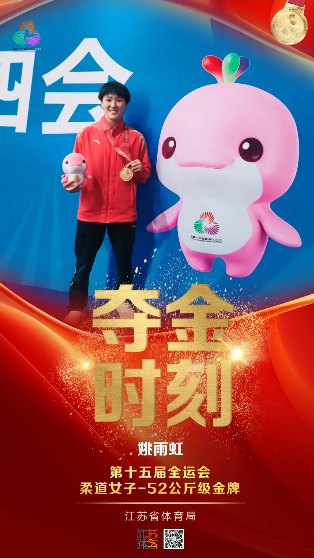 姚雨虹,出生于2001年,曾获得2024年度柔道积分赛(成都站)女子-52公斤级冠军,2025年全国柔道锦标赛女子-52公斤级冠军、世界柔道大满贯(蒙古国 乌兰巴托)-52公斤级季军。本届全运会夺冠,不仅是她十余年坚持刻苦训练、厚积薄发的结果,更是江苏柔道传承数代、拼搏不止的生动写照。